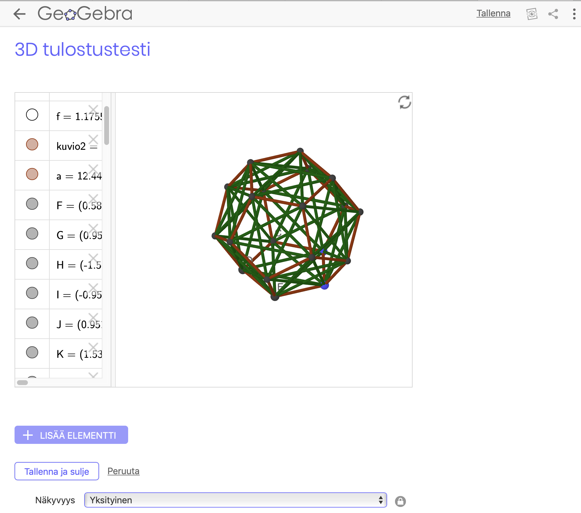 Edellisessä tarinassani ”Dodekaedri 3D-tulostukseen GeoGebralla” kerroin miten loin GeoGebra 5:llä dodekaedrin, jonka tahkojen tilalla oli pentagrammit. Tulostaminen 3D-printterillä onnistuu GeoGebra 3D ohjelman avulla.
