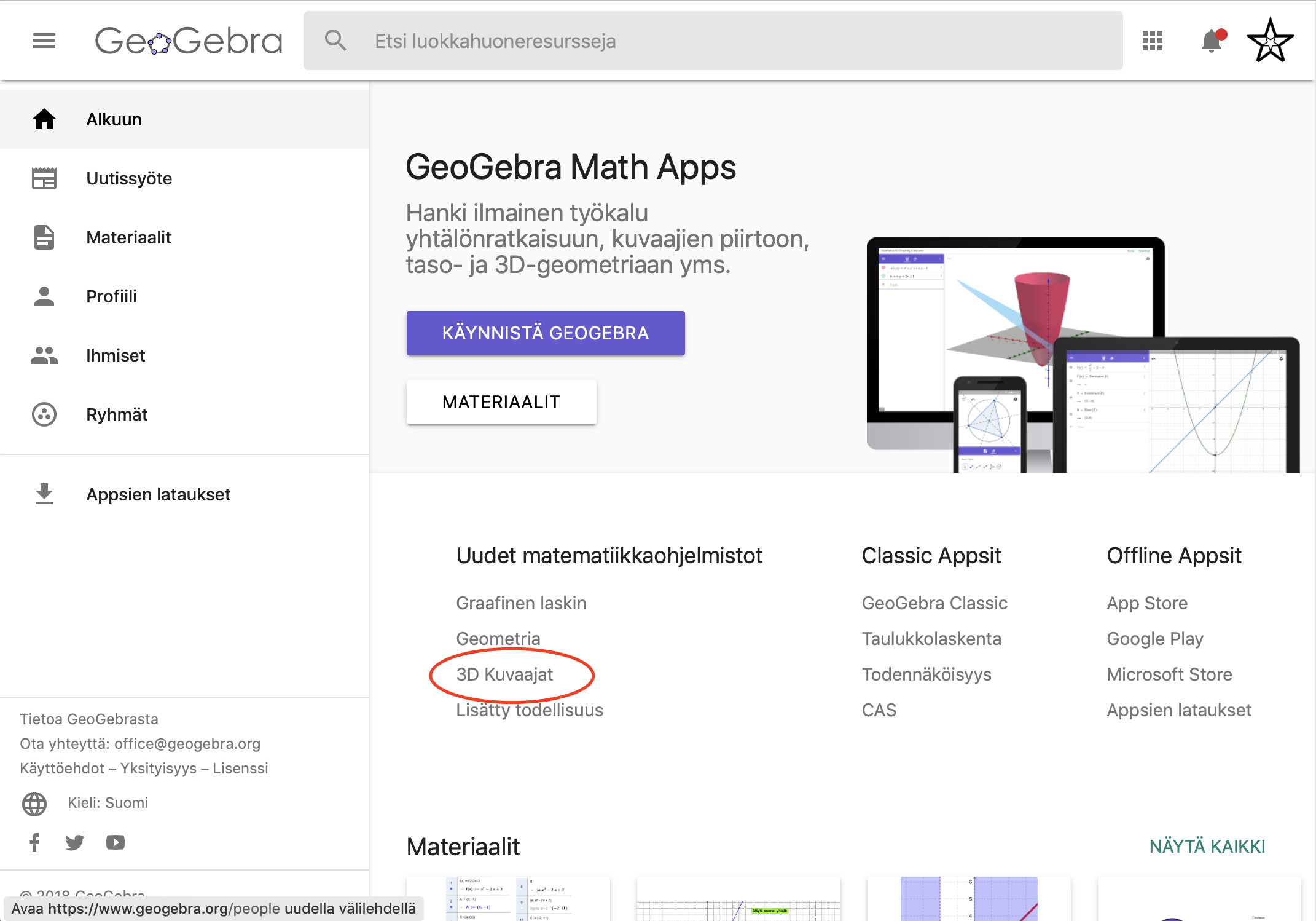 Klikataan GeoGebra-linkkiin selaimen ikkunassa eli siirrytään osoitteeseen https://www.geogebra.org. Klikataan sivulla kohtaan ”3D Kuvaajat”.