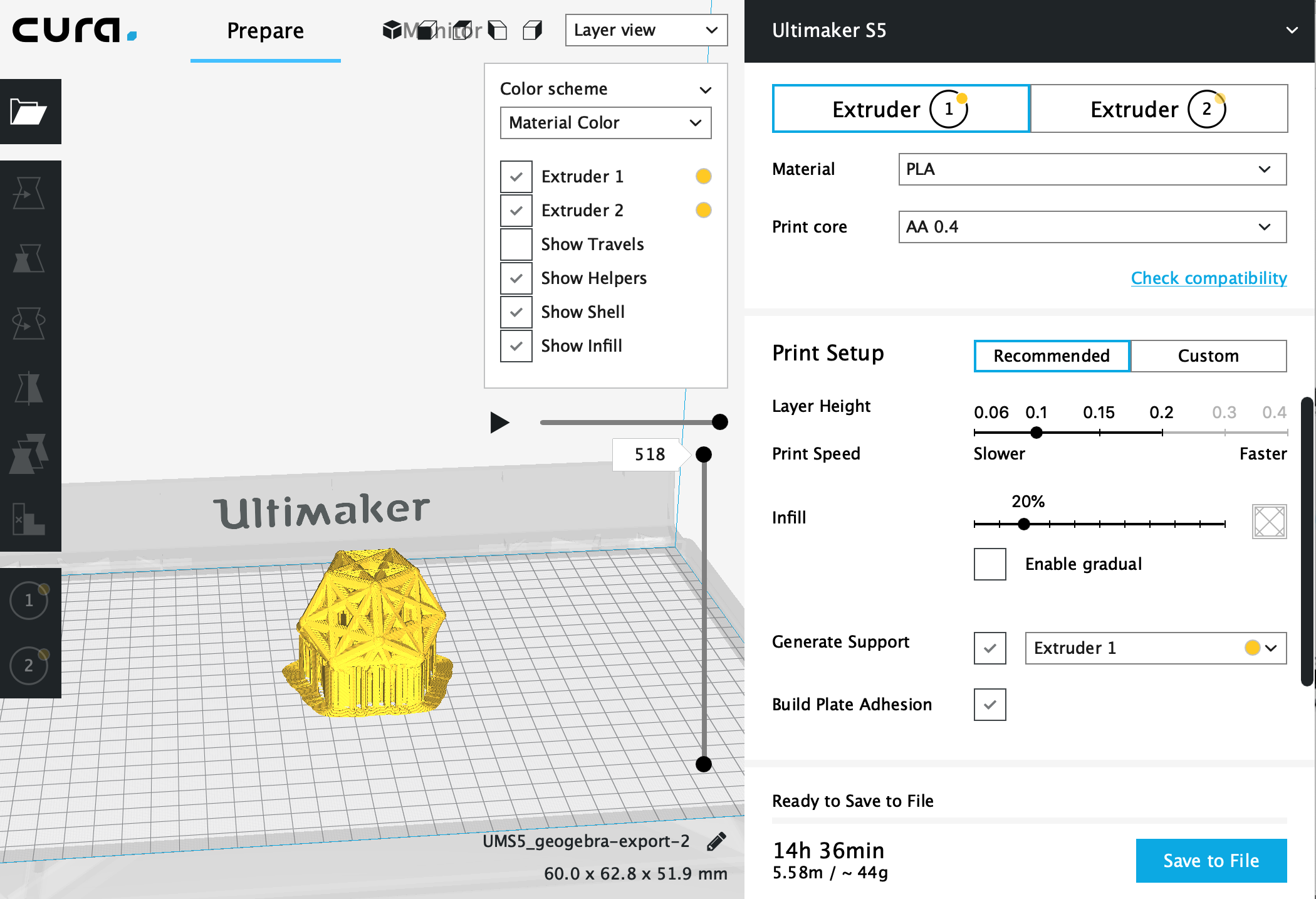 Tallennettua GeoGebra mallia voi tarkastella, muokata ja tulostaa vaikkapa Ultimaker Cura-ohjelmalla. Ilmaisohjelmanvoi ladata osoitteesta https://ultimaker.com/en/products/ultimaker-cura-software. Kun geogebra-export.stl avataan Curassa, klikataan keltaiseen kappaleeseen. Tällöin kappaletta voi pyöritellä ja sen kokoa voi muokata. Oheisessa kuvassa malliin on lisätty tuet. Ohjelma on Layer view tilassa.