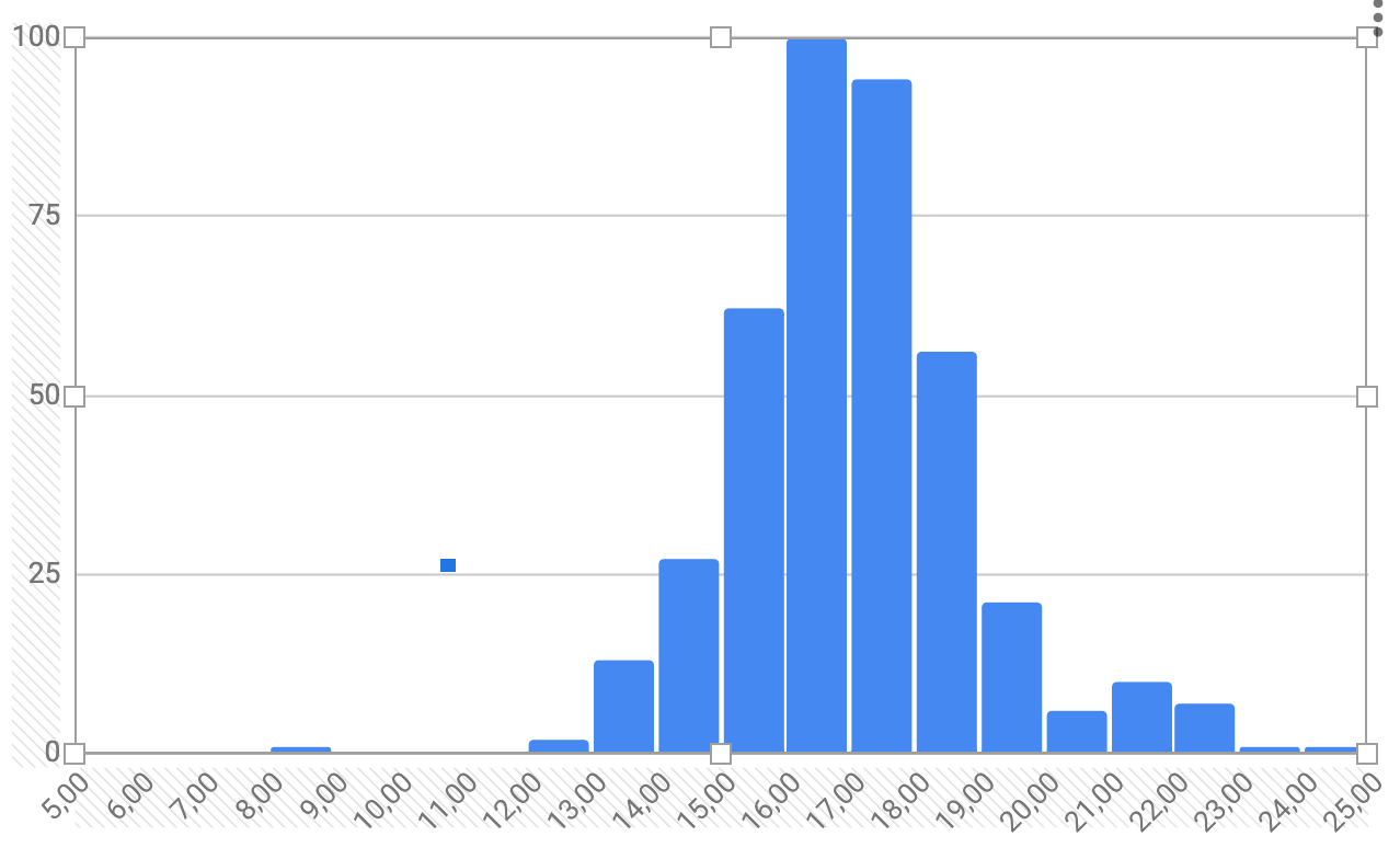 Lisätään loppuun bonuksena Google Sheetsin lähes ilmaiseksi tuottama histogrammi.