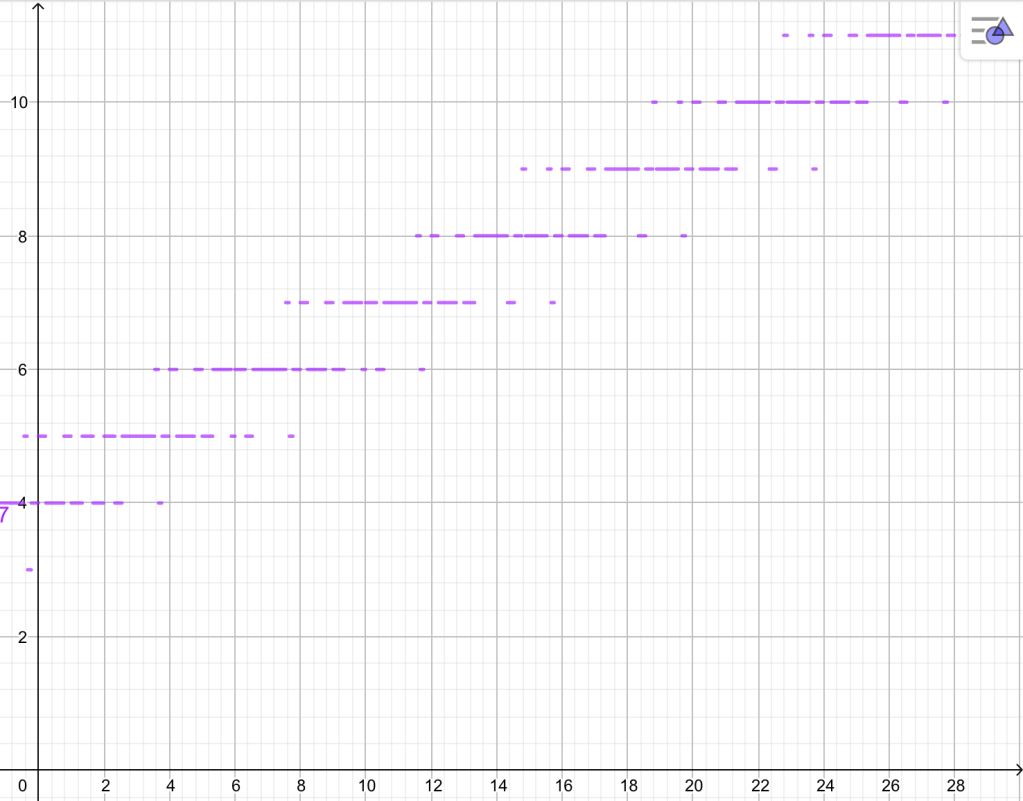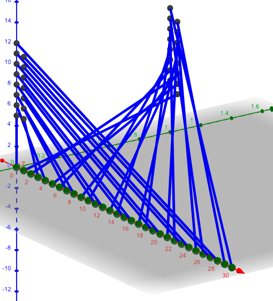 Ajatuksena on tuottaa GeoGebra 6:lla (onnistuu myös GeoGebra 5:llä ja GeoGebra 3D:llä) sovellus, jossa luodaan funktio c7(x), joka laskee taikatempun algoritmin tuottaman lopullisen luvin i. Koska GeoGebrassa ei voi rajoittaa lähtöjoukkoa vain luonnollisiksi luvuiksi, pitää ottaa huomioon kaikki reaaliluvut x ≥ 0. Tuotetun funktion ja lukujen a ja c parillisuuden avulla tuotetaan taulukkolaskennan avulla 3D pisteet. Nämä yhdistetään janoilla alkuperäisiin a arvoihin. Näin saadaan kuva kuvauksesta.