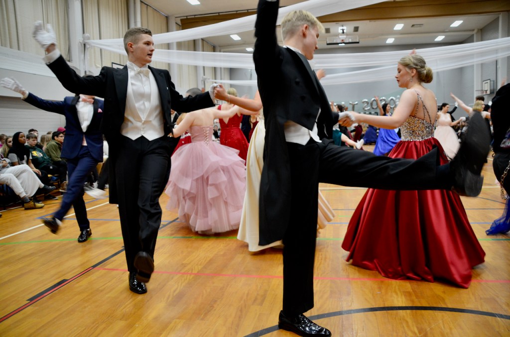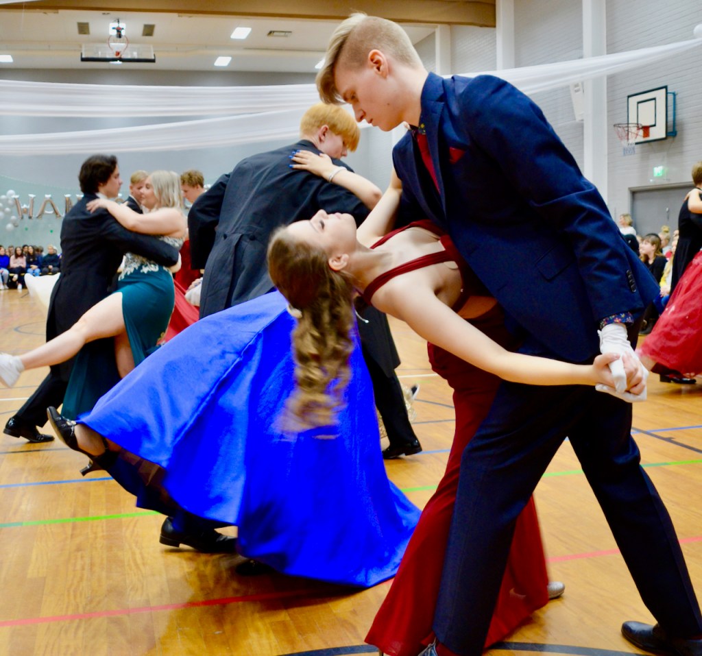 On Friday, during the school day, the seniors dance for the other pupils in our school. It is also a dress rehearsal for the official evening ball. In the evening, families and relatives gather to school to see the spectacular prom. 10th graders work for their senior students in the café and they also clean the ball room after the show.