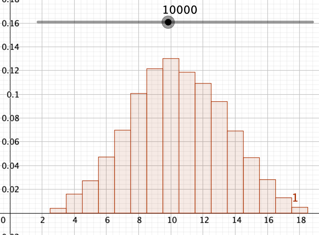 n = 20000 summat = Jono(Satunnaisluku(1, 6) + Satunnaisluku(1, 6) + Satunnaisluku(1, 6), nn, 1, n) pylväs = Pylväskaavio(summat, 1, 1 / n)
