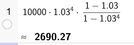 Käyttämällä Maksuerä( <Korko>, <Korkokausien lukumäärä>, <Nykyarvo>, <Tuleva arvo (valinnainen)>, <Laji (valinnainen)> ) -komentoa sama tulos saadaan kirjoittamalla CAS:iin: