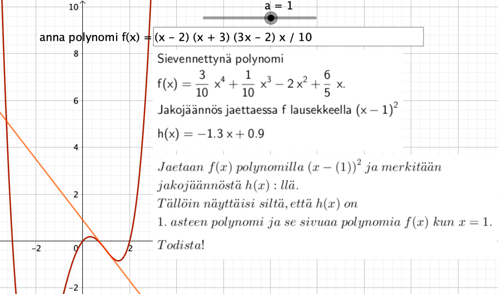Jos otat minkä tahansa polynomin ja jaat sen lausekkeella (x – a)^2, niin jakojäännökseksi tulee polynomi, jonka kuvaaja on suora, joka sivuaa alkuperäistä polynomia pisteessä a.