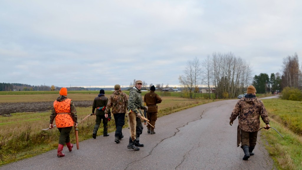 Lähdimme aamulla 8.30 metsälle. Metsästys toimii suurin piirtein seuraavalla tavalla. Valitaan sopivan kokoinen noin suorakaiteen muotoinen metsä. Metsästäjät asettuvat suorakaiteen toiseen päähän pellolle ja ajomiehet toiseen päähän. Ajomiehet kulkevat metsän läpi kalisuttelemalla klapeja ja pitämällä muuten meteliä. Tarkoituksena on pelästyttää jänikset lepopaikoiltaan ja ajaa ne jousiampujien luokse.