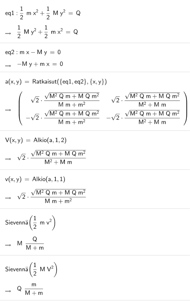 Fysiikan 7. kurssilla Aine ja säteily, lasketaan alfahajoamisessa vapautuva alfahiukkasen ja tytärytimen liike-energia. Yhtälöpari ratkeaa suhteellisen mukavasti kynällä ja paperilla, katsotaan miten saman asian voisi tehdä GeoGebralla. Samalla opitaan muutamia yhtälönratkaisuun liittyvää temppuja, jotka helpottavat laskijan elämää.