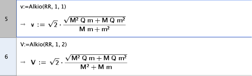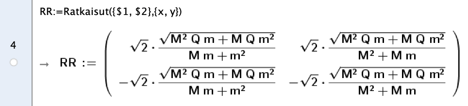 Tässä matriisin ylin rivi on ensimmäinen ratkaisu ja alin toinen. Vasen pystysarake on x ja oikea y. Merkitään v:llä ensimmäisen ratkaisun x:ää eli alfahiukkasen nopeutta ja V:llä tytärytimen nopeutta eli y:tä. Alkio-komennon avulla saadaan poimittua matriisista oikeat alkiot. Esimerkiksi Alkio(RR, 1, 2) valitsee RR-matriisista ensimmäisen rivin toisen alkion.