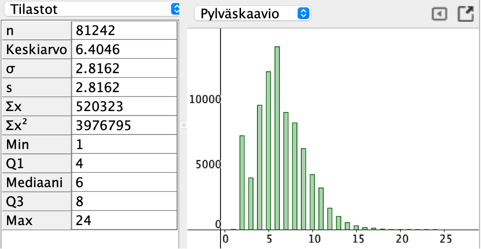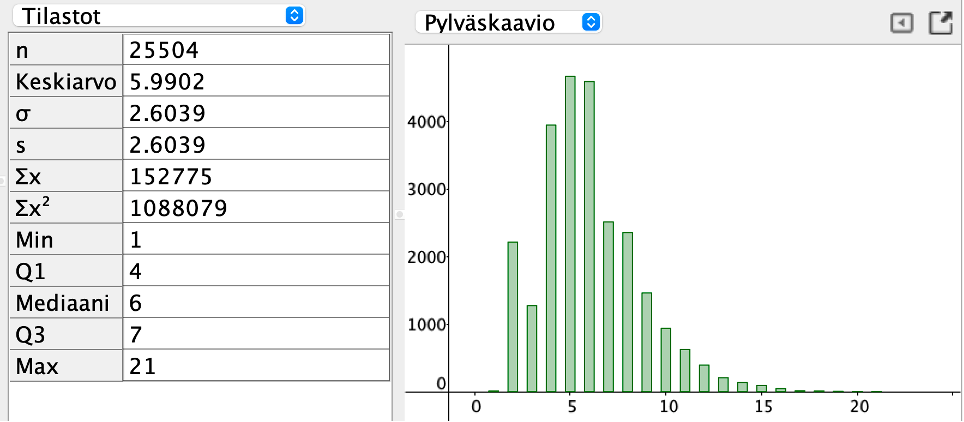 Sanojen pituusjakauma ja tilastotietoa GeoGebralla laskettuna.
