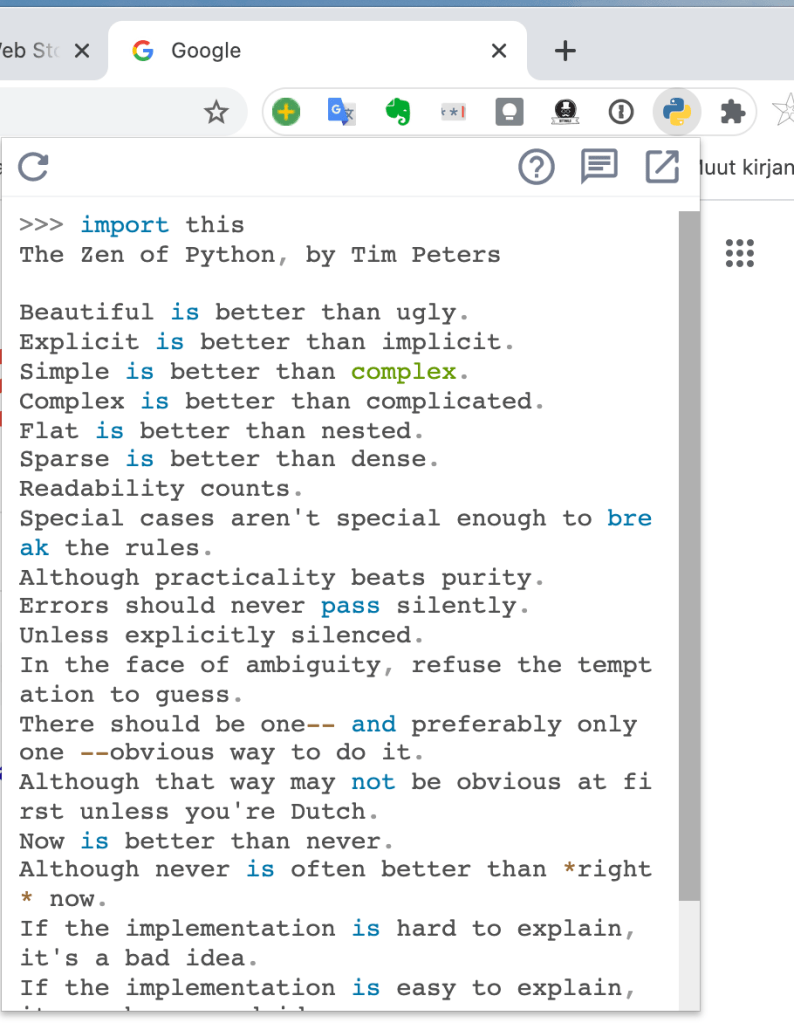 Kun Python-kielellä suorittaa ohjelmarivin ”import this” –, niin Python palauttaa Tom Petersin manifestin The Zen of Python. Vaikka olen jo muutaman vuoden leikkinyt Python-kielellä, niin enpä ole tätä aiemmin huomannut.