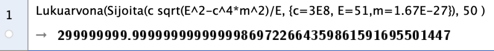 Nopeudeksi saadaan tasan 300000000 m/s. Vaikka GeoGebran asetuksista muuttaa tarkkuuden 15 merkitseväksi numeroksi, niin nopeuden arvo ei muutu.