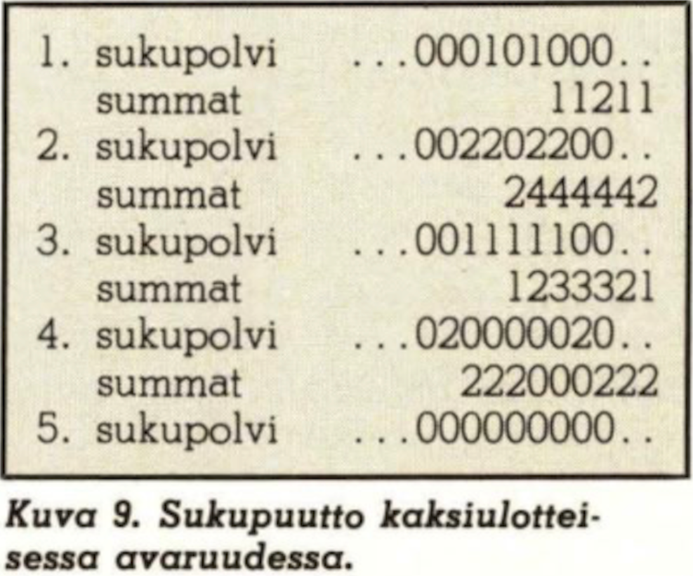 Elämä ei ole myöskään puristettu pelkästään kahteen ulottuvuuteen. Kolmiulotteisessa maailmankaikkeudessa ei ole muuta eroa kuin enemmän naapureita (kaksikymmentäkuusi). Vastaavasti kaksiulotteisessa [edit. tuossa on vikaa, pitää olla yksiulotteinen avaruus, tässä naapureiksi lasketaan kaksi naapuria molemmilta puolilta] vain neljä. Kuva 9 kuvaa kaksiyksiulotteisen mallin kehitystä ensimmäisten sukupolvien aikana.