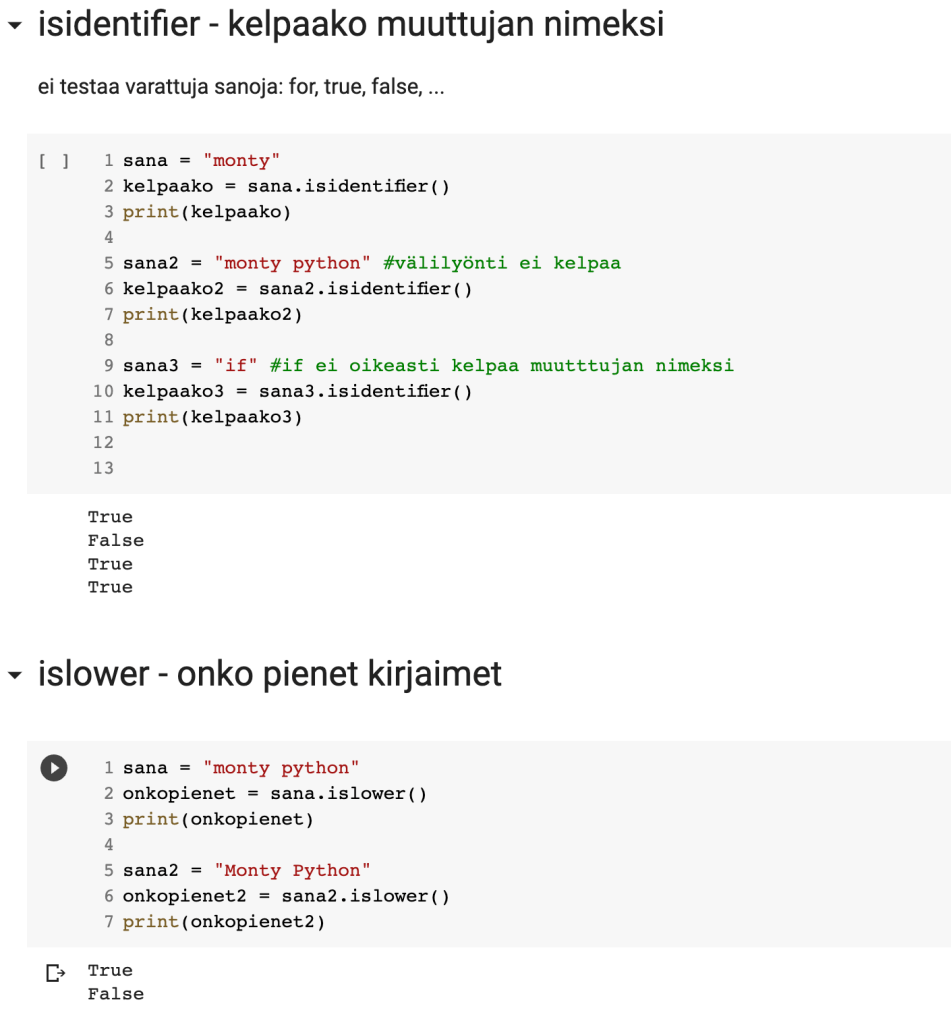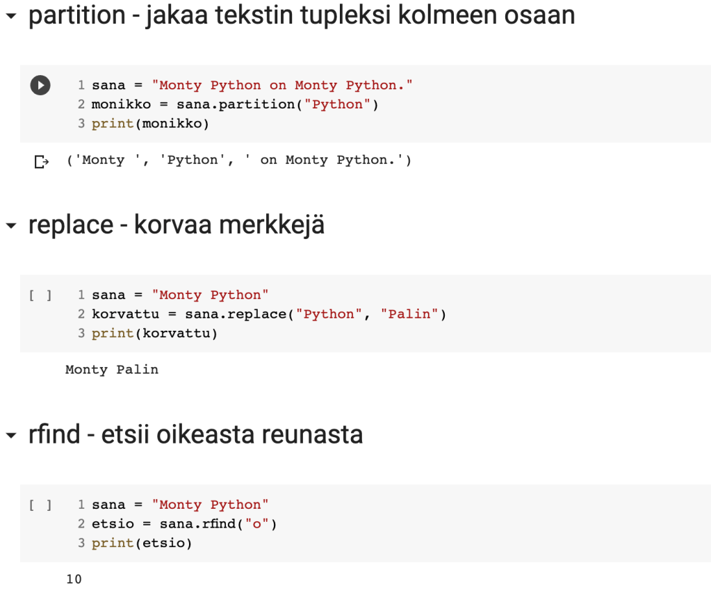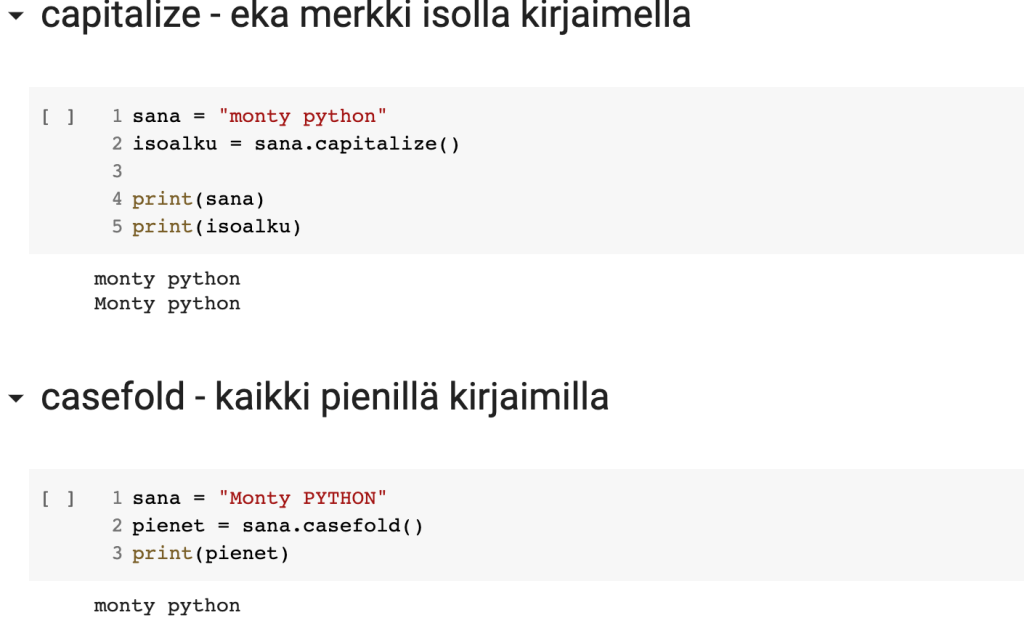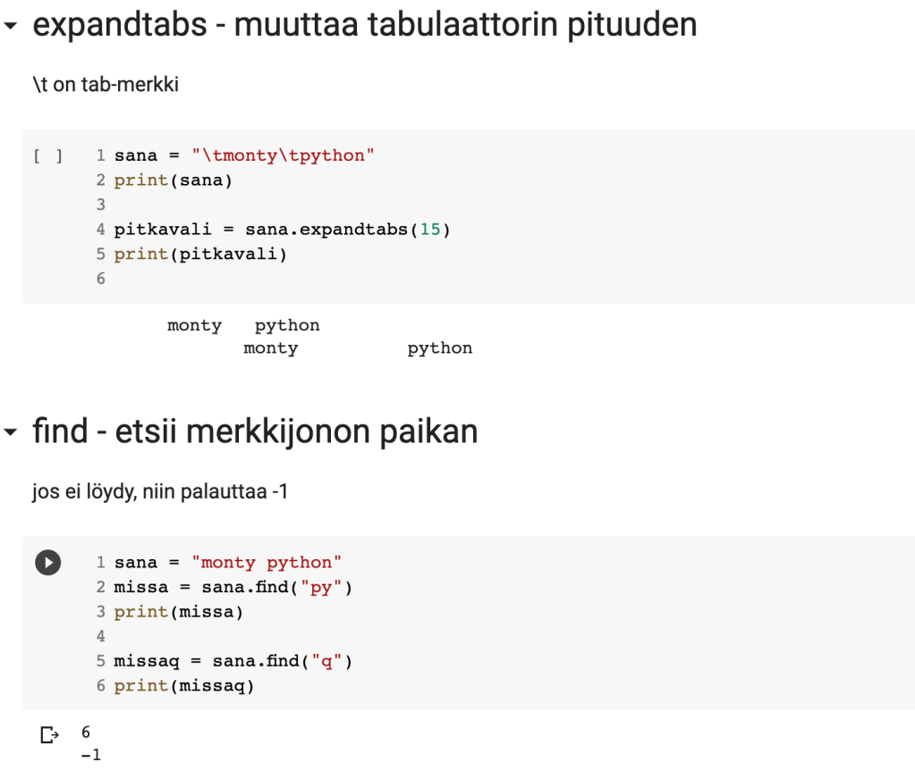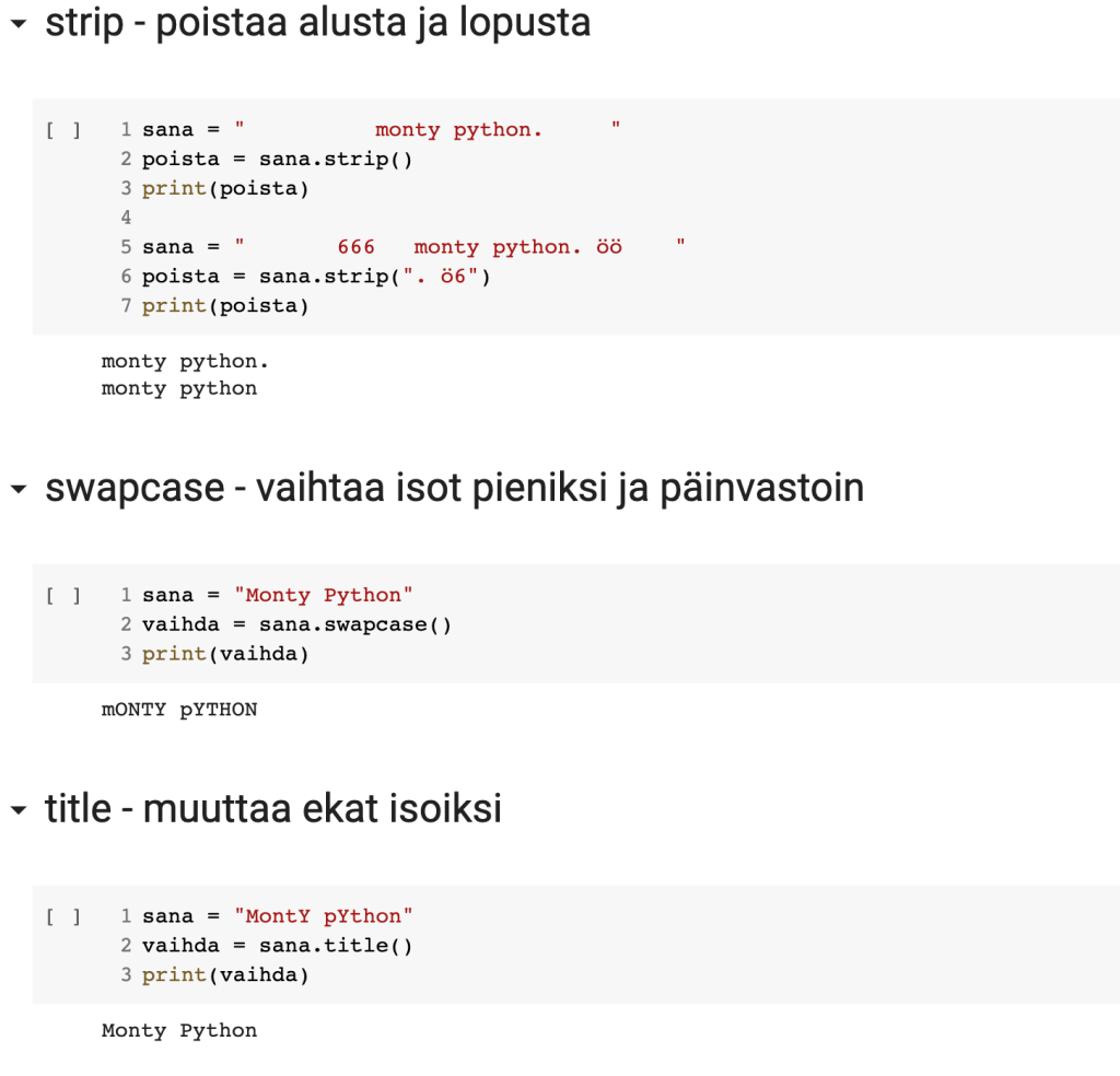 Pari viikkoa sitten julkaisin ”Listametodit esimerkeillä” – artikkelin. Tein samanlaisen Pythonin merkkijonometodeista. Mikään näistä ei muuta alkuperäistä merkkijonoa. Tarinan lopussa on linkki Colab-tiedostoon.
