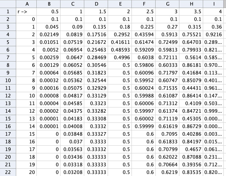 Tein alla olevaan GeoGebra-taulukkoon pienen testin iteraatiosta eri r:n arvoilla. Rivillä 1 sarakkeesta B alkaen on eri r:n arvoja, alkuarvona x0 = 0.1. A-sarakkeella näkyy iteraation indeksi n ja sarakkeilla B-H laskennan arvot.