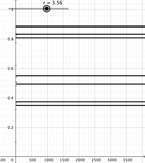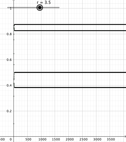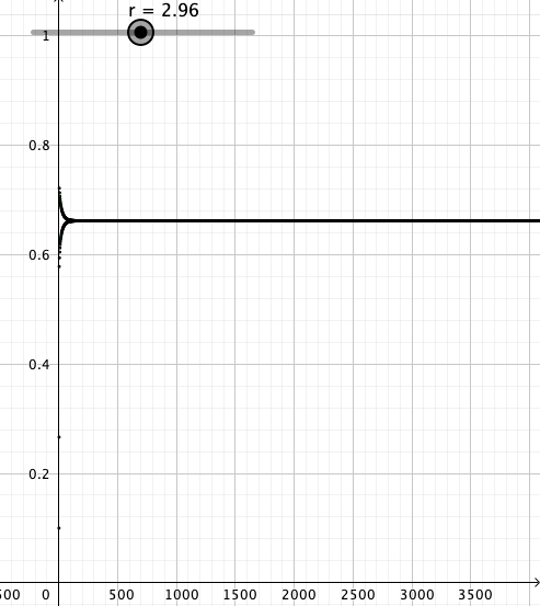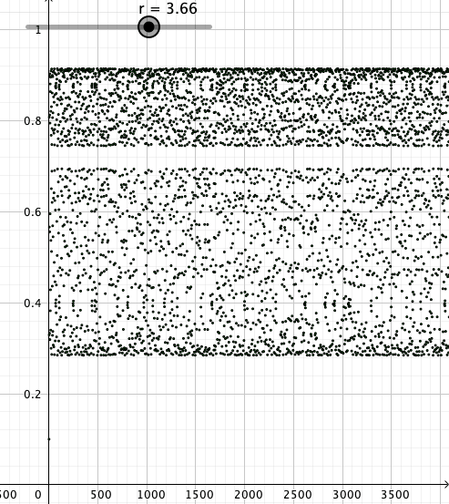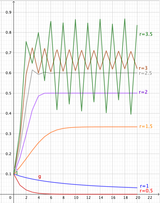 Vakion r arvoilla 0.5, …, 2.5 iterointi näyttää käyttäytyvän aika tylsästi. Lukujonot suppenevat kohti yhtä pistettä. r:n arvolla 3 jono näyttää hyppelehtivän kahden arvon välillä ja kun r = 3.5 lukujono hyppelehtii neljän luvun välillä. Taulukosta näkee, että r:n arvolla 4 lukujono hyppelehtii ihan sekavasti..