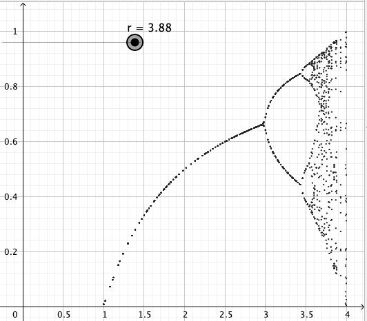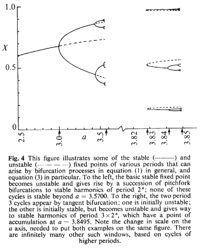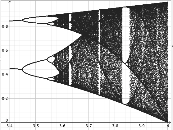 Tässä vaiheessa May ja kumppanit varmaankin päätyivät käyttämään apuna tietokoneita ja loivat kuvaajan, jota kutsutaan bifurkaatiodiagrammiksi. Mayn artikkelissa on oheinen kuvaaja. Mayn artikkelissa a vastaa tämän tarinan r:ää.