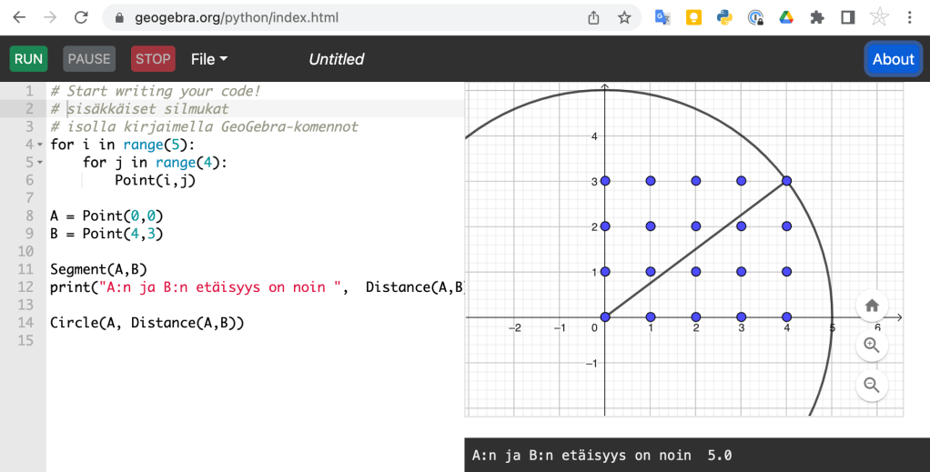 Kyseessä on ihan normaali Python ympäristö. GeoGebra-komennot kirjoitetaan isolla kirjaimella. Ne tuottavat olioita GeoGebran piirtoalueelle.