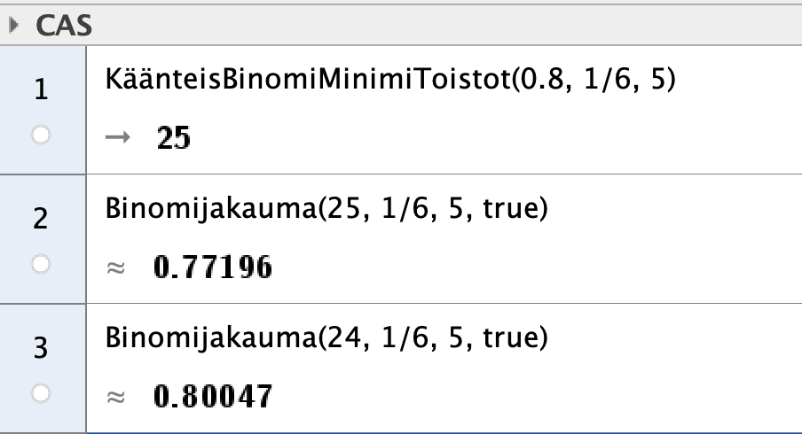 Uusi komento KäänteisBinomiMinimiToistot( <Todennäköysyyskertymä>, <Suotuisan tapahtuman tn>, <Onnistumisia> ). Tätä kirjoittaessa huomasin virheen Todennäköisyyskertymä-sanassa, korjaan sen pikimiten. KäänteisBinomiMinimiToistot(P, p, k). Kertoo sen kuinka monta kertaa pitää tehdä toistoja toistokokeessa, jotta todennäköisyyden kertymä saavuttaa arvon P. Esimerkiksi heitetään noppaa ja tutkitaa tuloksen 3 esiintymien lukumääriä (p = ⅙). Kuinka monta kertaa pitäisi heittää noppaa, jotta saataisiin viisi (k =5) todennäköisyydellä 0,8 (P = 0.8)