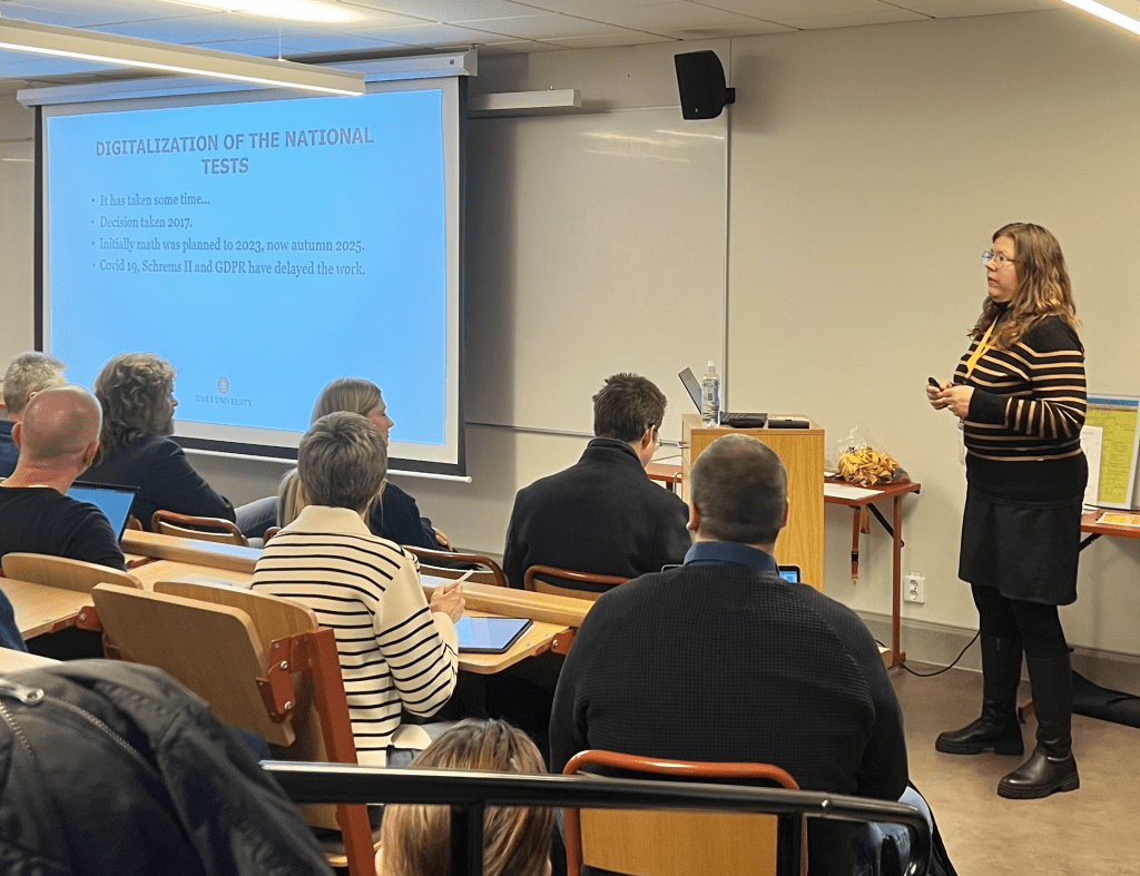 Lauantaiaamuna Anna Lind Panzare Uumajan yliopistolta (”Swedish Digital National Tests”) kertoi meneillään olevasta hankkeesta, jossa tuotetaan digitaalinen ylioppilaskoe Ruotsiin. Tavoitteena on, että järjestelmä olisi käytössä 2025. Minua ihmetytti se, että ruotsalaiset aikovat järjestelmästä huolimatta pitää matematiikassa osan kokeesta paperiversiona. Tässä asiassa Suomi tuntuu olevan hieman edellä läntistä veljeskansaamme.