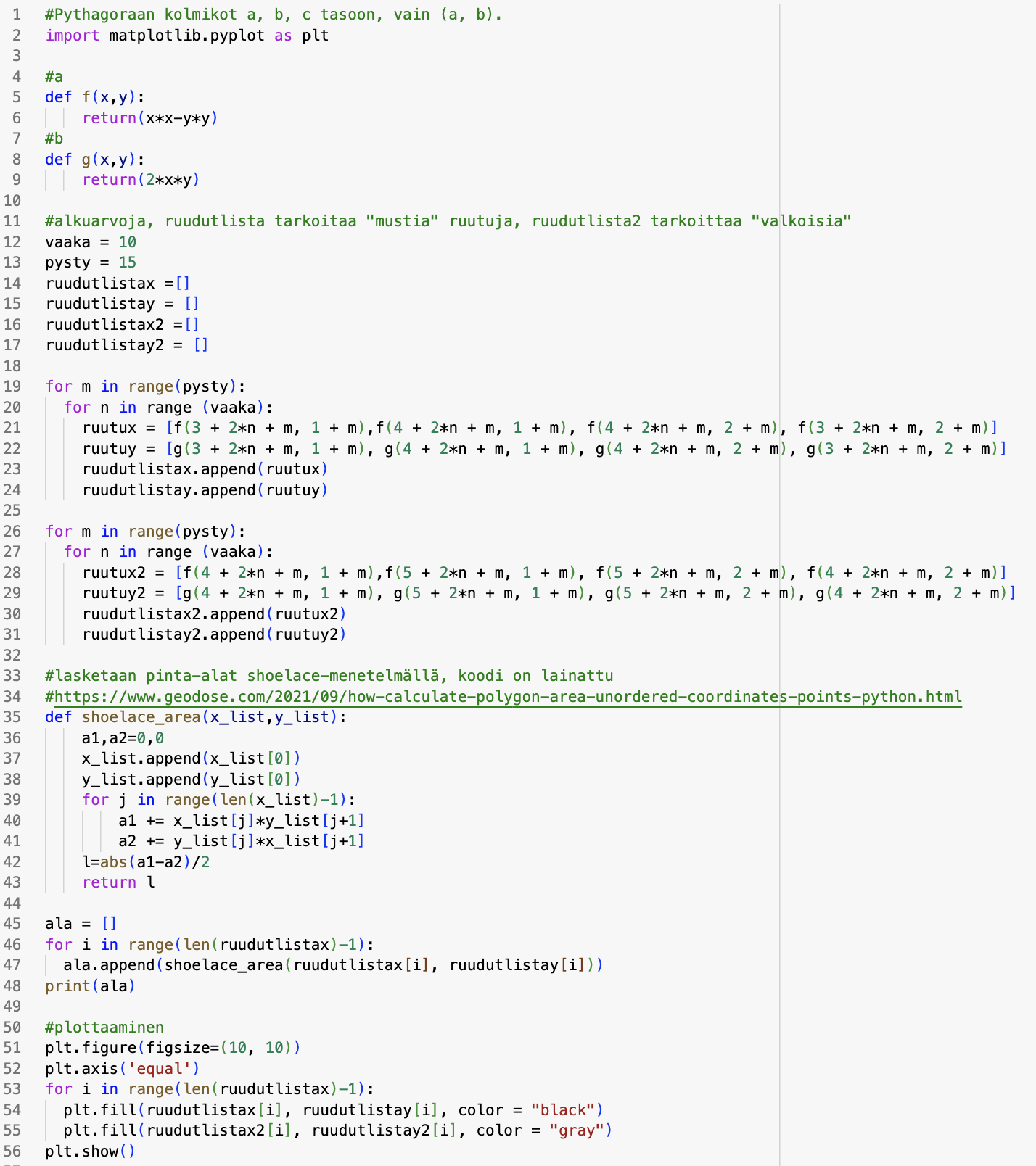 Alla kuva samaan aiheeseen liittyvä koodi Pythonilla ja matplotlib-kirjastolla. Koska matplotlibin fill(x, y) vaatii muuttujikseen erikseen listat x-koordinaateista ja y-koordinaateista, koodi on hieman hankalammin luettavaa (rivit 54-55).