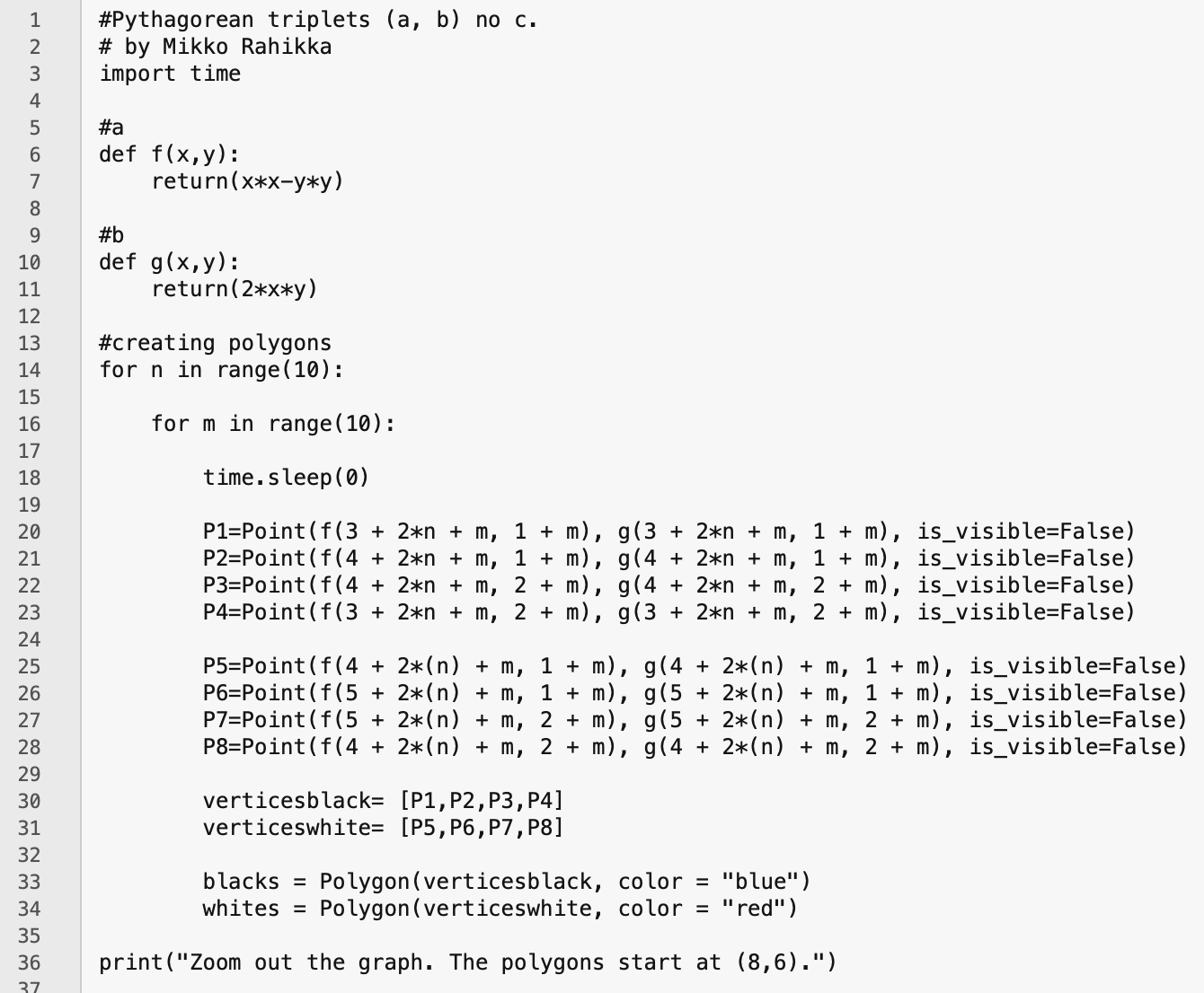 Tämän tuottamisessa sain hieman apua Michael Borcherdsilta. Hän ehdotti, että lisään time-kirjaston sleep()-funktion (rivi 18), jotta ei tarvitse odottaa koko kuvan valmistumista, ennen kuin se tulee näkyville Piirtoalueelle.