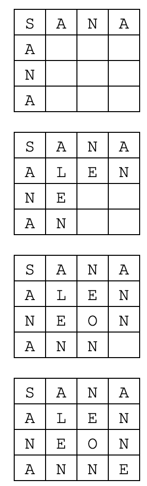Ristikko toimii seuraavasti. Valitse jokin sana. Minä valitsin tässä esimerkissä sanan ”SANA” esimerkkisanaksi. Tee sanan kirjaimien lukumäärän kokoinen neliön muotoinen ruudukko. Sanassa ”sana” on 4 kirjainta, niinpä ruudukko on kooltaan 4×4. Kirjoita valitsemasi sana alkavaan vasemmasta yläkulmasta. Kirjoita se vaaka ja pystysuunnassa. Seuraava sana tulee vaakasuunnassa edellisen alapuolelle ja pystysuunnassa oikealle puolelle.