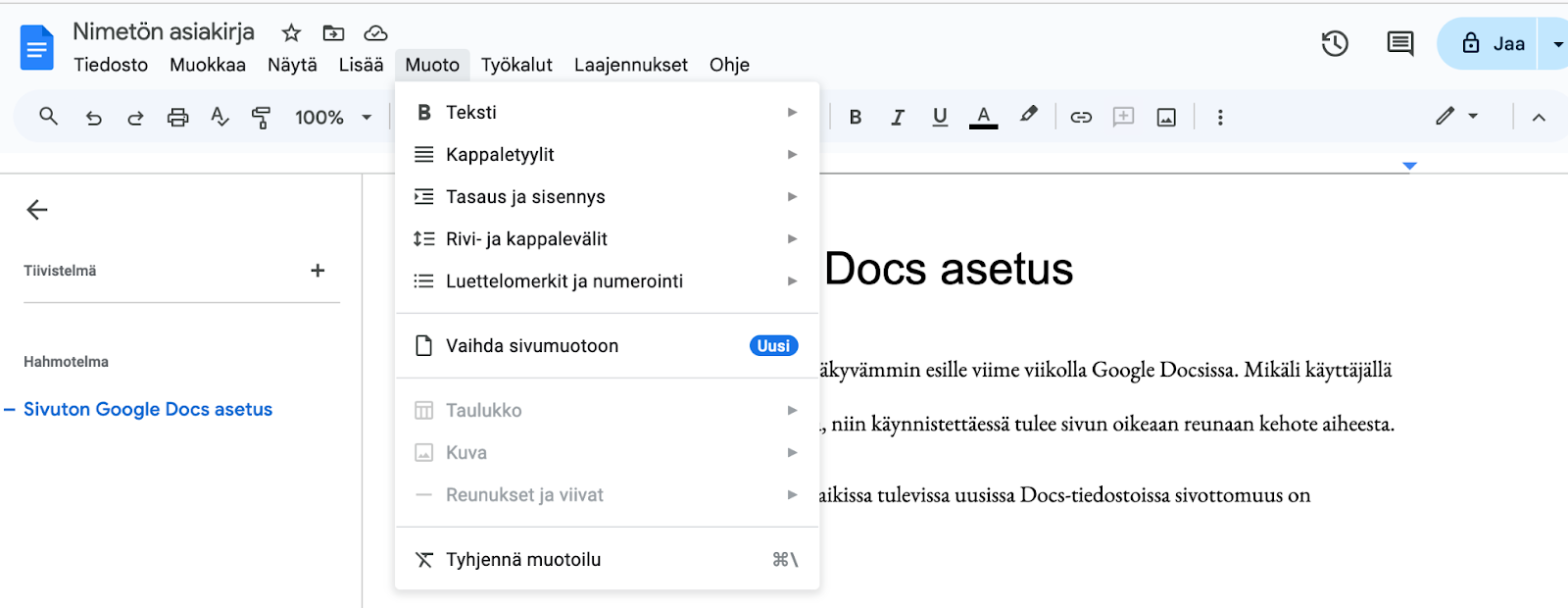 Samassa yhteydessä Sivuton muoto on lisätty Docsin Muoto-valikkoon.
