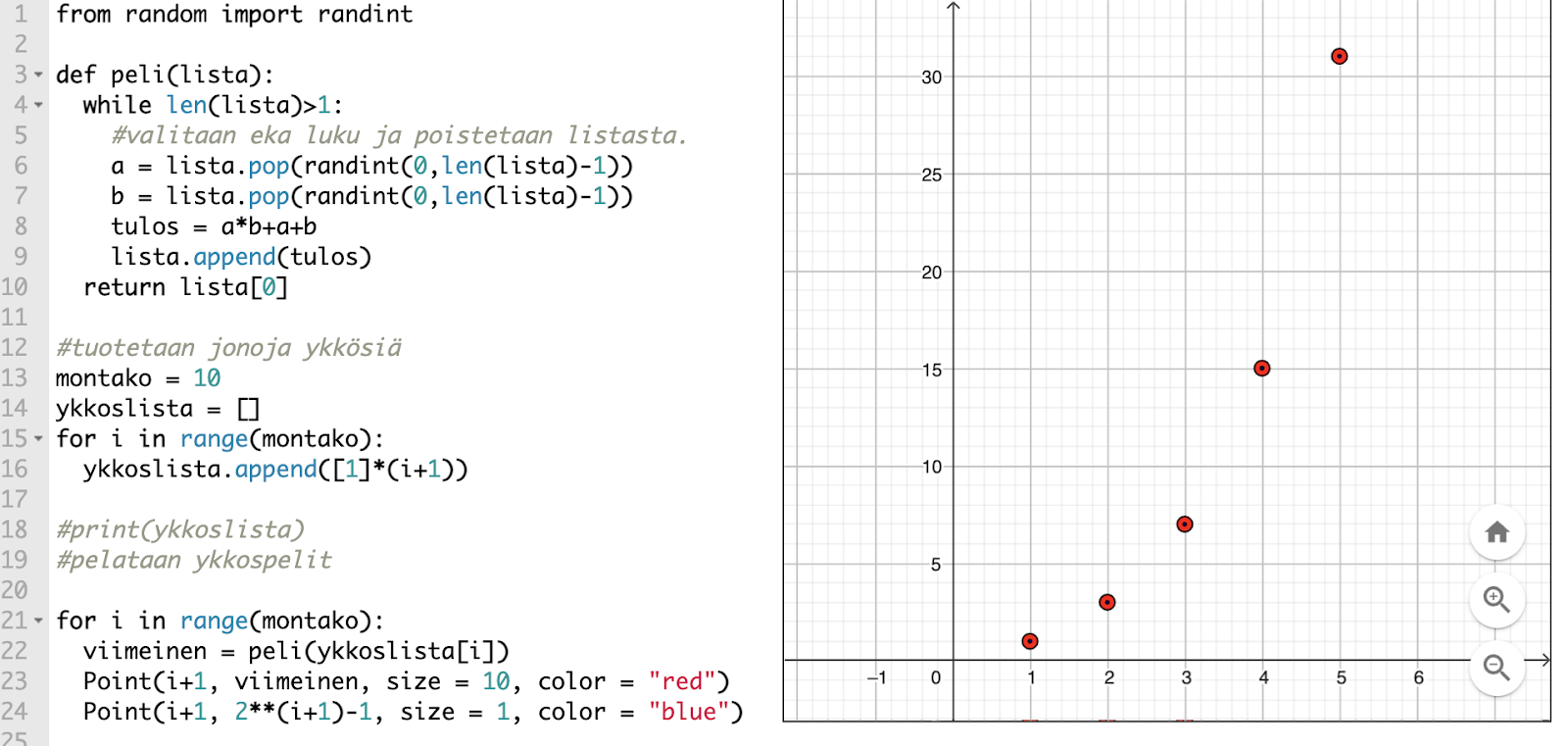 Rivien 21-24 for-silmukassa pelataan peliä ja GeoGebran Point-komennon avulla verrataan pelin lopputulosta n:n mittaisella ykköslistalla lukuun 2^n-1. Point tuottaa pisteen GeoGebran Piirtoalueelle. Vaikuttaa siltä, että nuo ovat samoja lukuja.