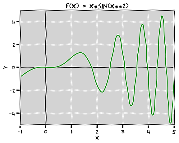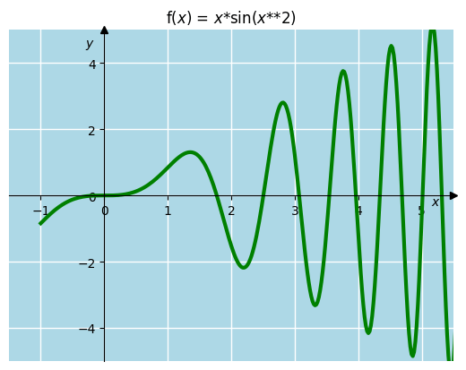 Piirretään seuraavaksi hieman ”tyylikkäämpi” kuvaaja. Tässä määritellään oma funktio f(x) = x*sin(x2) ja piirretään sen kuvaaja. Lisätään kuvaajaan myös perinteiset x ja y-akselit. NumPyssä on sisäänrakennettuna runsaasti matemaattisia funktioita, jotka toimivat oikein laskettaessa vektorien avulla. Kun funktioita käyttää, niin alkuun tulee lisätä np tyyliin np.sqrt(), np.sin(), np.arcsin(), …