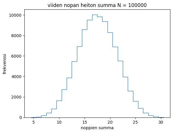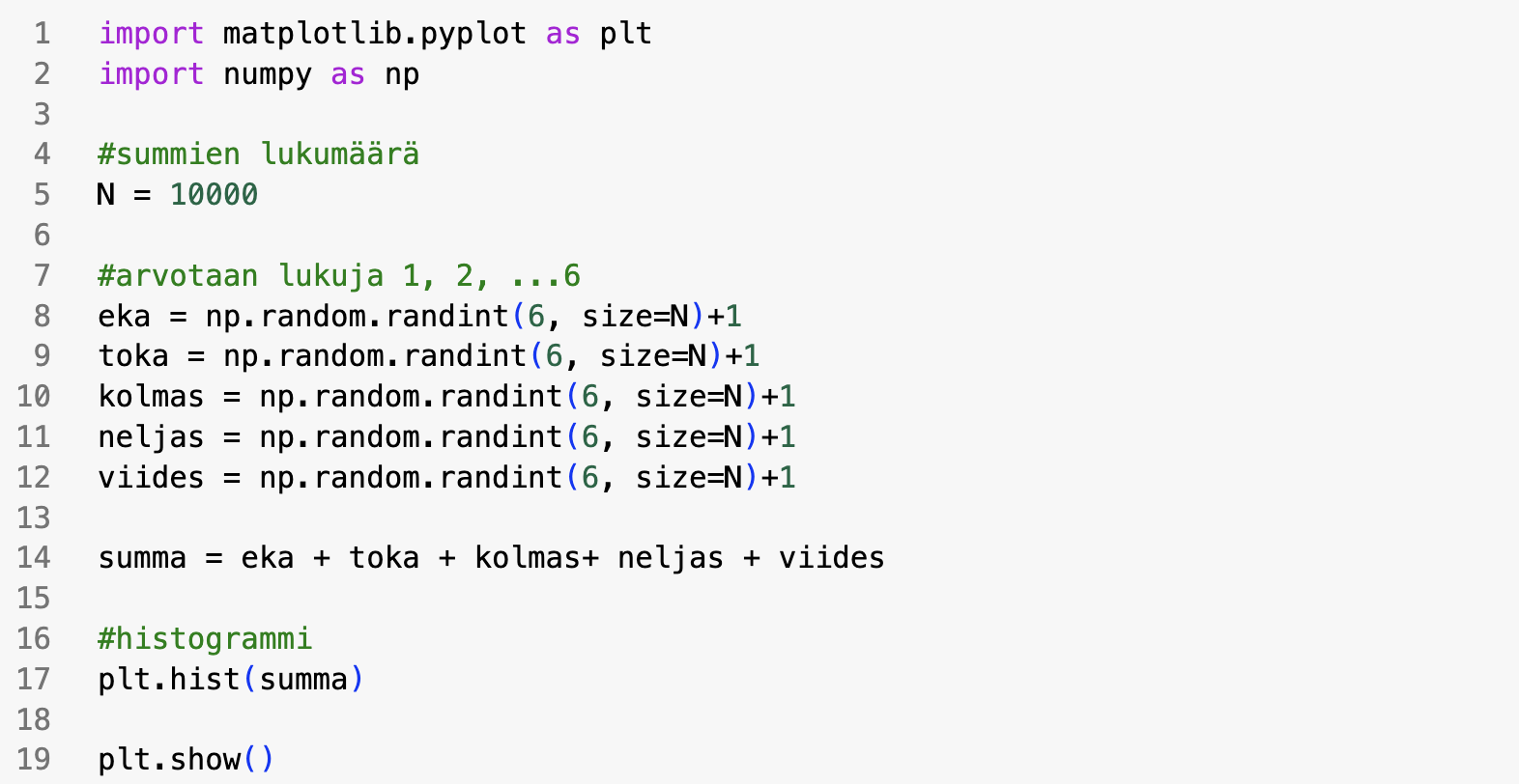 Heitetään viittä noppaa ja lasketaan niiden summa. Toistetaan tätä 10000 kertaa ja piirretään summien jakauma. Tässä esimerkissä näkyy, että NumPyn vektoreita käytettäessä ei tarvita yleensä for-silmukoita kun toistetaan samaa asiaa.