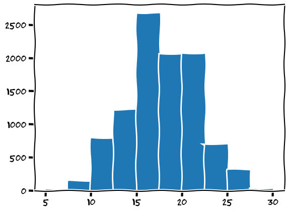 Hist-funktio jakaa oletusasetuksillaan luvut tässä tapauksessa 10 luokkaan. Kun katsoo jakauman reunoja, niin huomaa että siellä on jotain omituista, sillä pienin tulos on 5 ja suurin 30. Histogrammin vasen reuna alkaa pienimmästä luvusta ja oikea reuna päättyy suurimpaan lukuun.