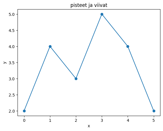 Aloitetaan yksinkertaisella esimerkillä. Piirretään Matplotlibillä pisteitä eri koordinaatteihin ja niiden väliin janoja. Tässä esimerkissä näkyy, miten Matplotlib skaalaa automaattisesti kuvaajan.