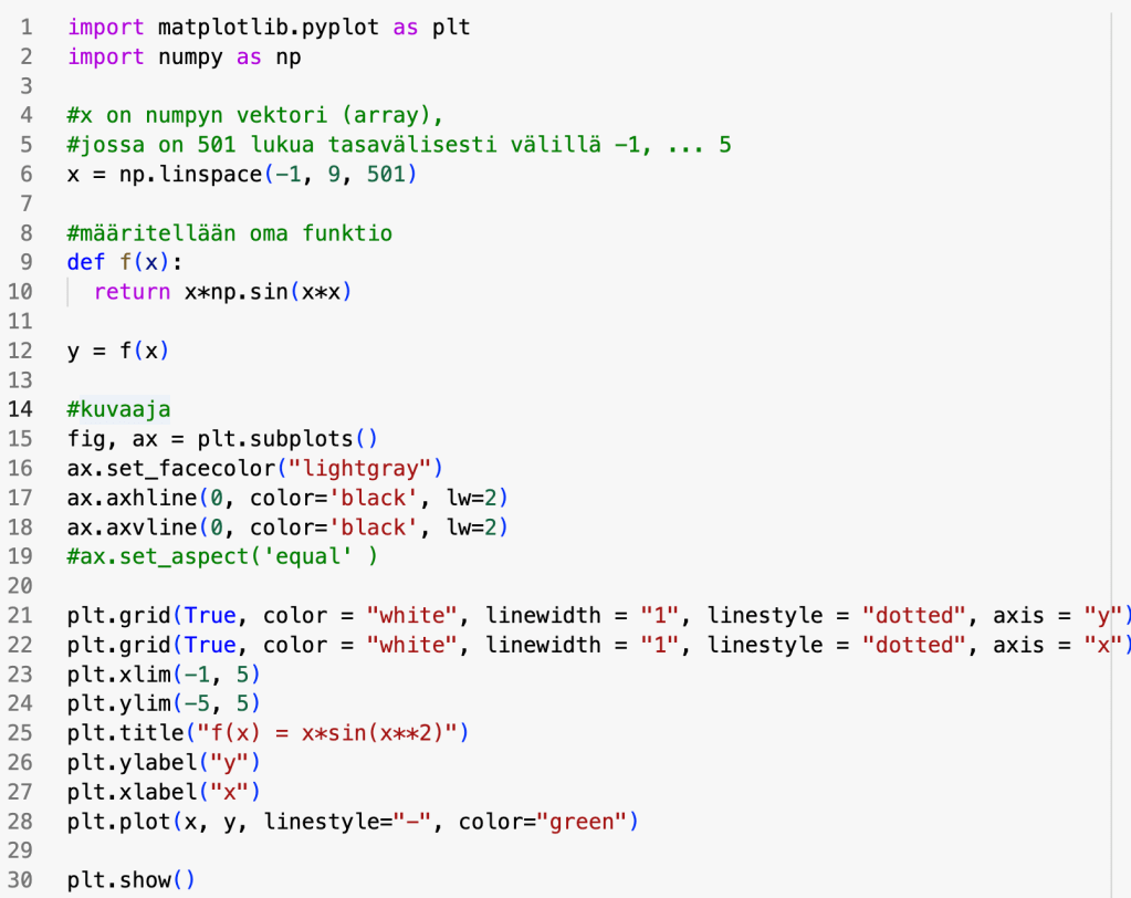 Riveillä 1-2 ladataan tarvittavat kirjastot. Huomaa, että Math-kirjastoa ei ladata, sen sin()-funktio ei toimi NumPyn vektoreiden kanssa oikein. Rivillä 10 käytetään NumPy:n sini-funktiota np.sin().