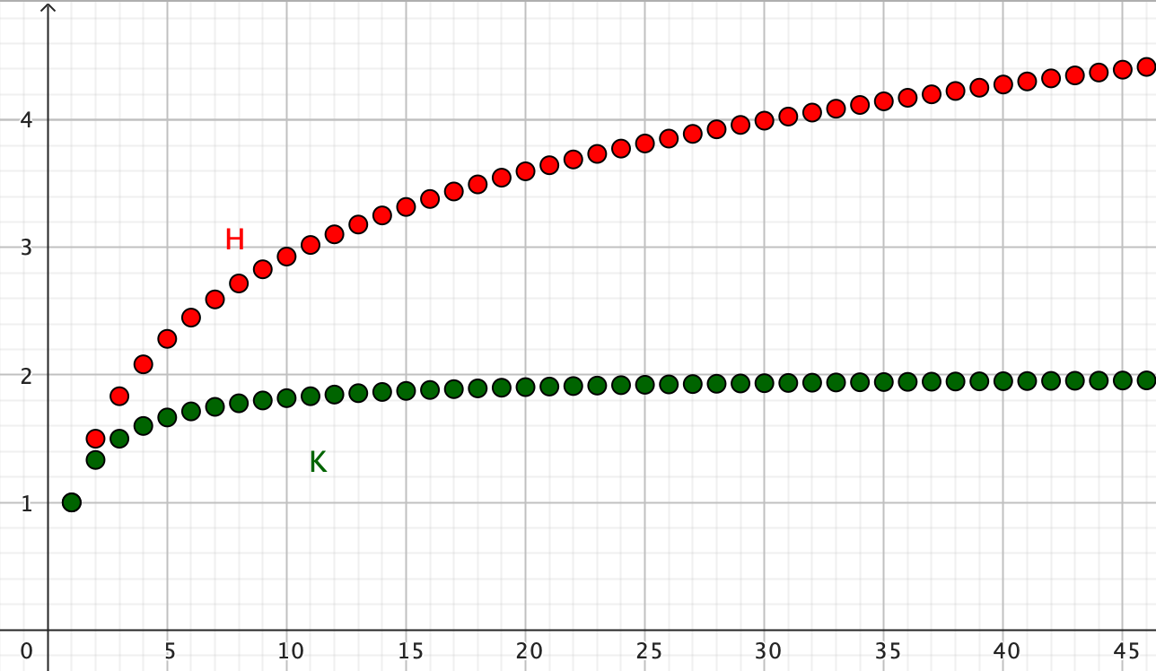 Harmoninen sarja H kasvaa rajatta, tosin aika hitaasti. Tutkittava K-sarjan arvot näyttävät pysyvän kakkosen alapuolella. Vaikuttaa siltä, että sarja suppenee. Nyt vaan pitäisi todistaa se. Jätän todistuksen lukijalle ja avuksi liitän toisen helpon ongelman, jota voi käyttää K-sarjan suppenemisen todistuksen apuna. Ja toki suppenemisen voi todistaa käyttämättä apuna ilman tuota apulausetta. Parhaat laskijat pystyvät tuottamaan todistukset ilman CAS-laskimen apuja :o)