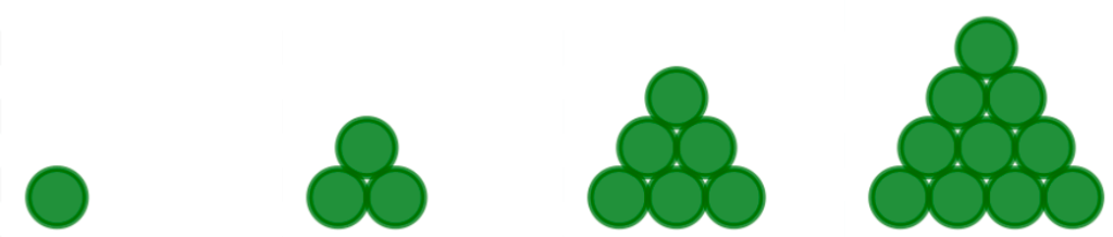 Kolmioluvuiksi kutsutaan lukuja 1, 3, 6, 10, 15, 21, …. Jos käytössä on kolmioluvun verran biljardipalloja, niin ne saa kasattua kolmioiksi kuvan tapaan.
