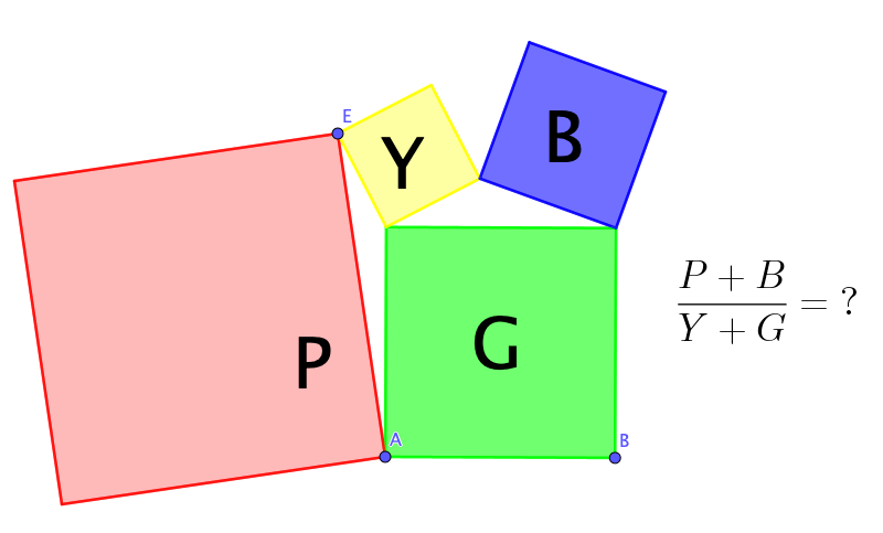 Oheisessa kuvassa on neljä neliötä, siten, että kärjet ovat samoissa pisteissä kuten kuviossa. Pitää määrittää (punaisen neliön ala + sinisen neliön ala)/(keltaisen neliön ala+vihreän neliön ala).