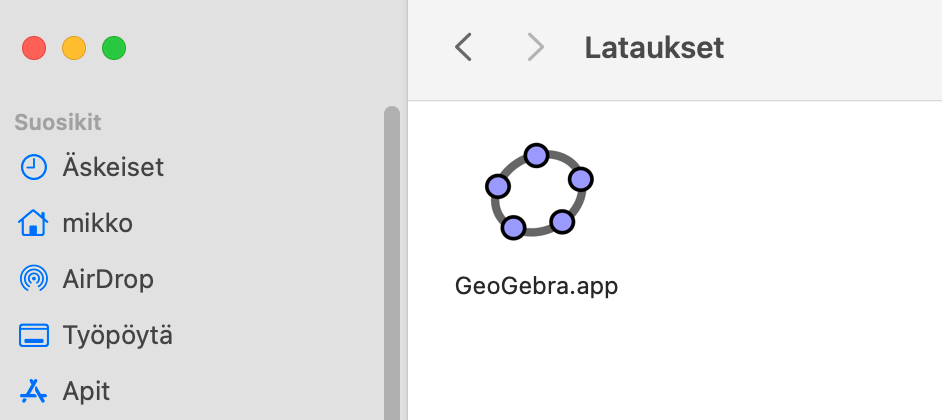 Ennen kuin lataat uusimman version GeoGebra 5:stä Macille, niin lopeta GeoGebra 5, mikäli se on avoinna. Kun olet ladannut GeoGebra 5 asentajan (linkki löytyy Installation sivun lopusta), niin Lataukset-kansioon ilmestyy uusin GeoGebra-ohjelma.