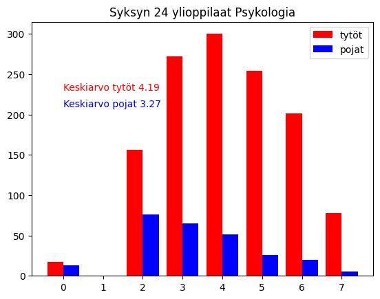 Psykologiassa tyttöjen keskiarvo oli huima 0,78 arvosanaa parempi kuin pojilla. Erotus on tilastollisesti erittäin merkitsevä (p < 0,001).