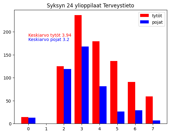 Terveystietoisien tyttöjen keskiarvo oli 0,84 arvosanaa parempi kuin pojilla. Erotus on tilastollisesti erittäin merkitsevä (p < 0,001). Tämä on suurin erotus kirjoitetuissa aineissa.