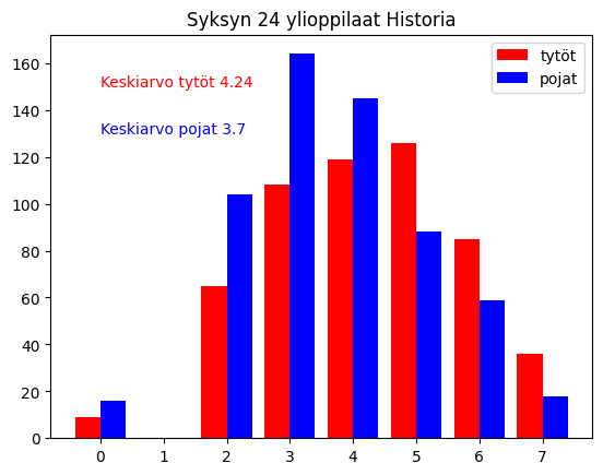 Historiaa HI kirjoitti 548 tyttöä ja 594 poikaa. Keskiarvo tytöillä oli 0,53 arvosanaa parempi kuin pojilla. Erotus on tilastollisesti erittäin merkitsevä.
