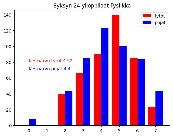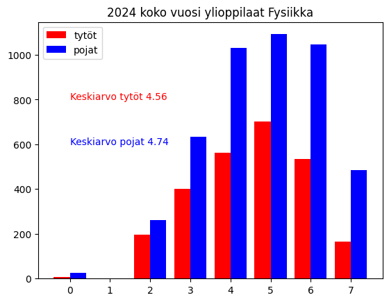 Fysiikkaa FY kirjoitti 443 tyttöä ja 488 poikaa. Fysiikassa tytöillä keskiarvo oli noin 0,12 arvosanaa parempi. Fysiikassa huomio kiinnittyy siihen, että pojat saivat enemmän laudatureja kuin tytöt.