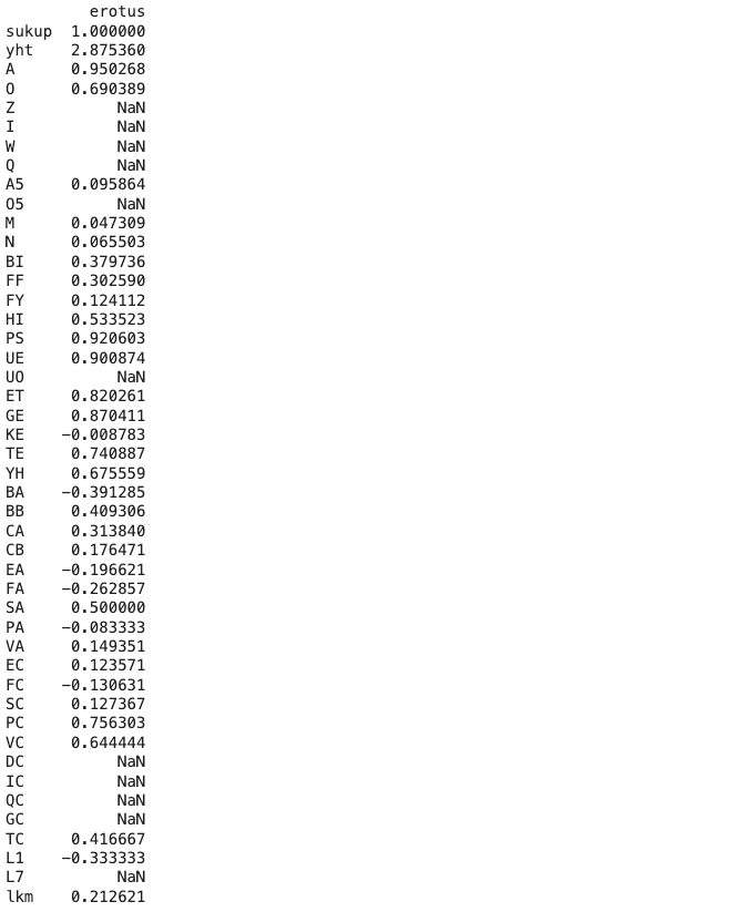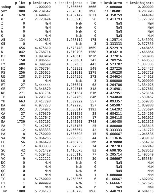 Alla on eri aineiden kirjoittaneiden lukumäärät, keskiarvot ja keskihajonnat taulukkona. NaN (Not a Number) on Python kielen tapa ilmaista, että kyseistä lukua ei voi laskea. Esimerkiksi, jos listassa on nolla lukua, niin listan alkioista ei voi laskea keskiarvoa tai keskihajontaa. Yht tarkoittaa puoltoäänien summaa ja lkm kirjoitettujen aineiden lukumäärää.