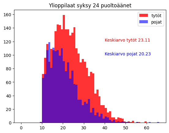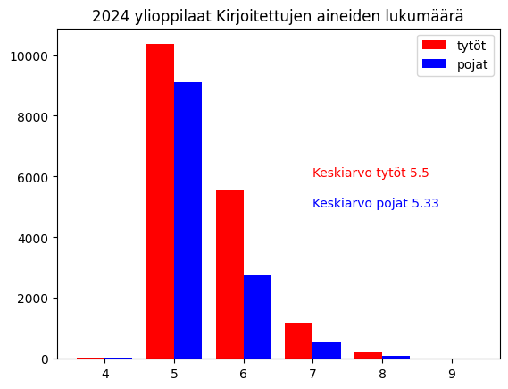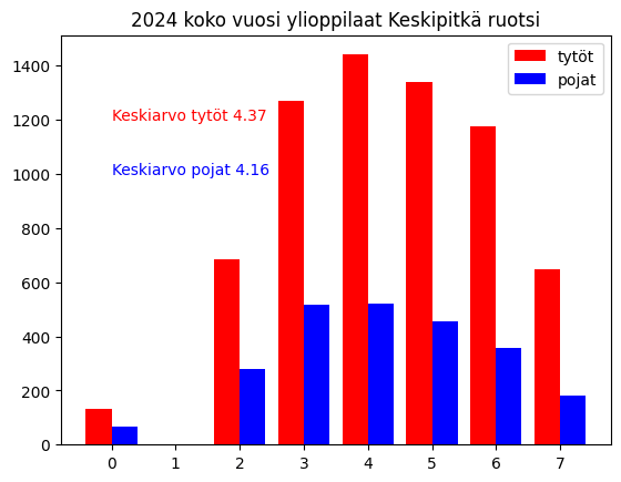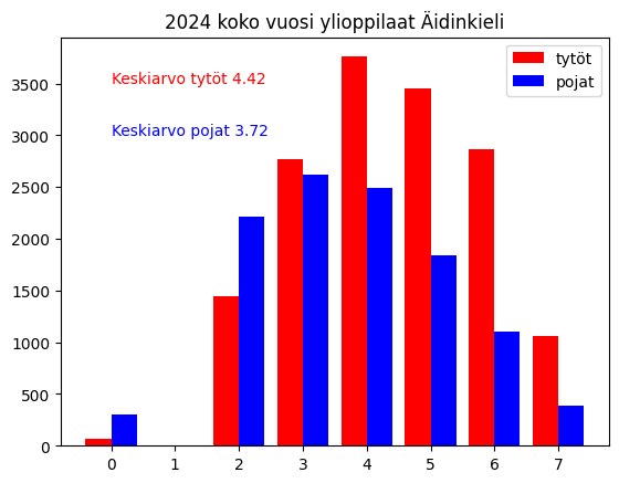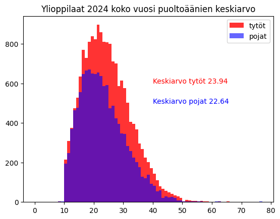 Tytöillä puoltoäänien keskiarvo oli 0,1 arvosanaa parempi kuin pojilla. Ylioppilasarvosanojen keskiarvo oli tytöillä 4,30 ja pojilla 4,20. (Vuonna 2023 tytöillä 4,29 ja pojilla 4,16).