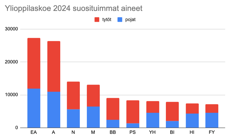 Ylioppilastutkintolautakunnan julkaisemissa tiedostoissa on paljon ylioppilasoppilaskohtaista tietoa: koulu, sukupuoli, opetuskieli, puoltoäänien lukumäärä ja eri oppiaineiden arvosanat. Kun yhdistin sekä kevään, että syksyn 2024 ylioppilasarvosanatiedostot, niin taulukossa oli 29901 riviä ja 51 saraketta.