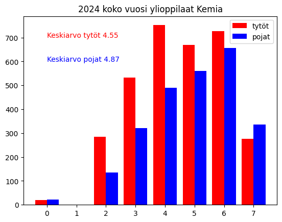 Kemiaa KE kirjoitti 610 tyttöä ja 271 poikaa. Poikien keskiarvo oli 0,0088 arvosanaa parempi kuin tytöillä, eli keskiarvot olivat lähes samat.