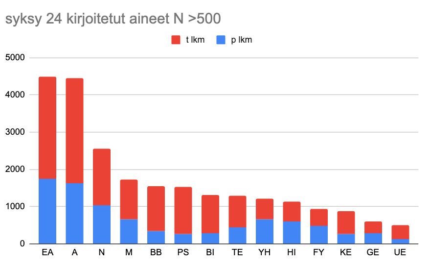 Tällä kertaa käsittelen syksyn ja koko vuoden ylioppilaiden tuloksia samassa tiedostossa. Olen piirrellyt ylioppilaskokeiden tyttöjen ja poikien arvosanajakaumia vuoden 2022 keväästä alkaen. Linkit edellisiin aiheen artikkeleihin ja tässä tarinassa käytettyyn Python lähdekoodiin löytyvät artikkelin lopusta. Siellä on myös taulukko oppiainekoodeista.