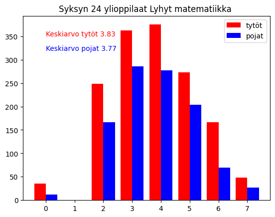 Lyhyessä matikassa tyttöjen keskiarvot olivat 0,0003 arvosanaa parempia eli keskiarvot olivat lähes yhtä suuret.