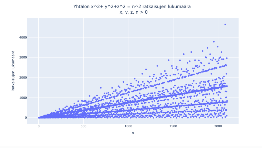Kun ratkaisin Pythagoralaiset nelikot n:n arvolla 2025 sain eri 3012 ratkaisua. Tässä yhteydessä annoin Googlen Colabissa Gemini tekoälyn auttaa kuvaajien piirrossa. Enää ei tarvitse Googletella miten Matplotlibin ja Plotlyn asetuksia muutetaan, kysyy vain Geminiltä ja se tuottaa tarvittavan koodin.
