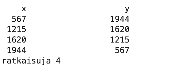 Ongelma 3. Kuinka suuri on suurimman sellaisen suorakaiteen tilavuus, jonka sivujen pituudet (x, y, z) ovat yhtälön x2 + y2 + x2= 20252 kokonaislukuratkaisuja. Samalla kiinnostaa myös suurin tilavuus, jos hyväksytään myös irrationaaliratkaisut.