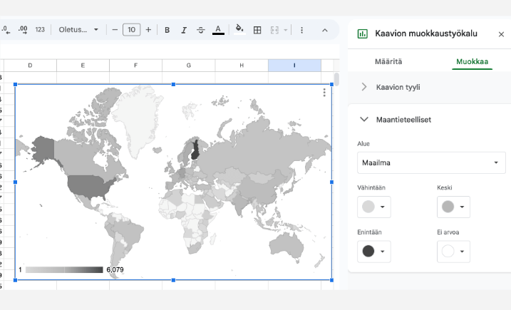 Kopioin maakohtaisen taulukon ja muokkausten jälkeen sijoitin kaksi saraketta Google Sheetsiin. Lisäsin kaavion ja Määritä välilehdeltä valitsin Kartta.